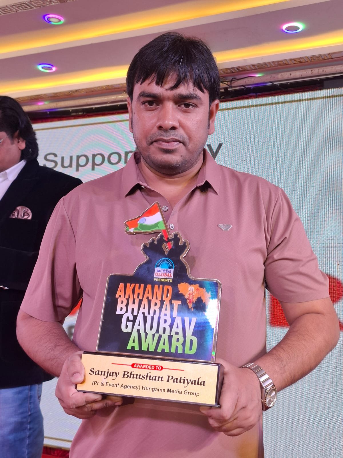 मुंबई में आयोजित एक भव्य समारोह में, बॉलीवुड एक्टर जे ब्रैंडन हिल ने प्रसिद्ध फिल्म प्रचारक संजय भूषण पटियाला को "अखण्ड भारत गौरव अवार्ड" से सम्मानित किया।