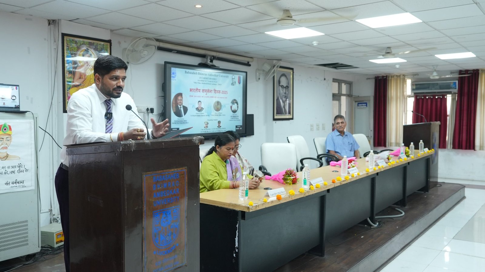 बाबासाहेब भीमराव अम्बेडकर विश्वविद्यालय लखनऊ में विश्वविद्यालय के यशस्वी कुलपति प्रो. राज कुमार मित्तल के दिशा निर्देशन में विश्वविद्यालय में भारतीय वायु सेना दिवस का आयोजन 20 यू . पी. गर्ल्स बटालियन एनसीसी, 67 यू पी बटालियन एनसीसी द्वारा किया गया। कार्यक्रम की शुरुआत सभी अतिथिओं द्वारा दीप प्रज्वलन और बाबासाहेब की प्रतिमा पर माल्यार्पण करके हुई। कार्यक्रम की आयोजक सूचना प्रोद्योगिकी विभाग की विभागाध्यक्ष और एन सी सी ऑफिसर कैप्ट. डा. राजश्री और कुलानुशासक ने सभी अतिथियों का स्वागत पुष्पगुच्छ देते हुये किया और स्मृति चिह्न देकर उनका सम्मान किया। कार्यक्रम में मुख्य अतिथि के रूप में सेंचुरियन डिफेन्स एकेडमी के चेयरमैन शिशिर दीक्षित ने अपने उद्बोधन में बताया की यह दिन उन वायु योद्धाओं के साहस और बलिदान को याद करता है जो आसमान से देश की रक्षा करते हैं और आपदाओं में सहायता करते हैं इस दिन एयर फ़ोर्स स्टेशन पर भव्य परेड और एयर शो का आयोजन किया जाता है, जिसमें वायुसेना की ताकत और शौर्य का प्रदर्शन होता है। उन्होंने सभी कैडेट्स को कर्तव्य निष्ठा, अनुशासन और गौरव से जीवन जीने के लिए प्रेरित किया। विशिष्ट अतिथि के रूप में कर्नल राजेश कुमार ने बताया कि सभी एनसीसी कैडेट्स को देश के प्रति सम्मान और निष्ठा की भावना रखनी चाहिए और नागरिकों को अपना जीवन देश की एकता, अखंडता और समृद्धि के लिए समर्पित करना चाहिए और देश के प्रति अपनी जिम्मेदारी का पूर्ण रूप से निर्वहन करना चाहिए। विशिष्ट अतिथि के रूप में मेजर कृष्णा दुबे ने उपस्थित जन समूह को भारतीय वायु सेना के पराक्रम पर प्रकाश डाला और बताया कि जीवन में जो भी कार्य करें देश को सर्वोपरि रख कर करें। कार्यक्रम में प्रो. राम चंद्रा कुलानुशासक , ले. डा. मनोज कुमार डडवाल, डा . अमित कुमार सिंह के साथ बड़ी संख्या में विश्वविद्यालय के छात्र/ छात्राओं के साथ एनसीसी कैडेट्स उपस्थित थे|