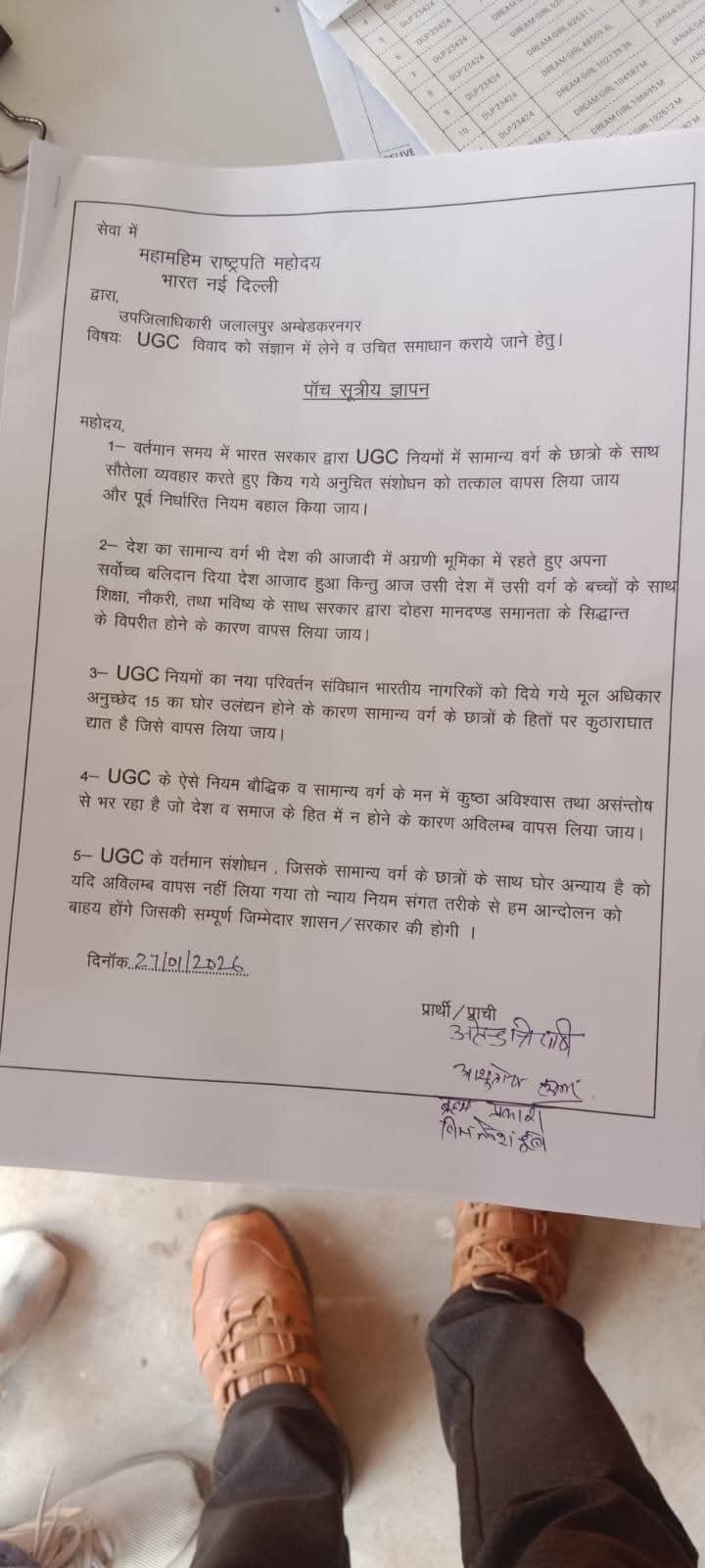 जलालपुर (अम्बेडकरनगर)। यूजीसी (विश्वविद्यालय अनुदान आयोग) के नए नियमों से उत्पन्न होने वाली समस्याओं को लेकर जलालपुर के उपजिलाधिकारी को ज्ञापन सौंपा गया। यह ज्ञापन संत प्रसाद पांडे के नेतृत्व एवं अतेंद्र त्रिपाठी के संयोजन में दिया गया। ज्ञापन के माध्यम से यूजीसी द्वारा लागू किए गए नए नियमों के कारण छात्रों, शिक्षकों एवं शैक्षणिक संस्थानों को होने वाली परेशानियों की ओर प्रशासन का ध्यान आकृष्ट कराया गया तथा संबंधित बिल को वापस लिए जाने की मांग की गई। इस अवसर पर अतेंद्र त्रिपाठी, संत प्रसाद पांडे, अधिवक्ता महेंद्र सिंह, अधिवक्ता सत्य प्रकाश मिश्रा, अधिवक्ता आशुतोष, विमलेश दुबे, ब्रह्म प्रकाश तिवारी, मंजुल, जीवन प्रकाश, हरि मोहन चतुर्वेदी सहित दर्जनों लोगों ने ज्ञापन पर हस्ताक्षर कर अपना समर्थन दर्ज कराया। ज्ञापन सौंपने वालों ने चेतावनी दी कि यदि यूजीसी के नए नियमों पर पुनर्विचार नहीं किया गया, तो आंदोलन को और व्यापक रूप दिया जाएगा।