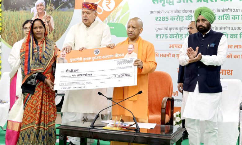 मुख्यमंत्री जी आज यहां अपने सरकारी आवास पर प्रधानमंत्री फसल बीमा योजना (खरीफ 2025) के अन्तर्गत 2.51 लाख किसानों को 285 करोड़ रुपये की क्षतिपूर्ति राशि तथा मुख्यमंत्री कृषक दुर्घटना कल्याण योजना के अन्तर्गत 3,500 परिवारों को 175 करोड़ रुपये की सहायता राशि के वितरण कार्यक्रम में अपने विचार व्यक्त कर रहे थे। उन्होंने बटन दबाकर लाभार्थियों के खाते में धनराशि प्रेषित की। इसके साथ ही, उन्होंने प्रधानमंत्री फसल बीमा योजना, मुख्यमंत्री कृषक दुर्घटना कल्याण योजना तथा कृषि यंत्रीकरण के लिये अनुदान योजना के 05-05 लाभार्थियों को प्रतीकात्मक चेक प्रदान किये तथा 05 युवा आपदा मित्रां को जीवन बीमा कवर प्रदान किया। उन्होंने उत्तर प्रदेश राज्य कृषि विकास योजना के अन्तर्गत बागपत, शामली, कासगंज और भदोही में उप कृषि निदेशक कार्यालय एवं मृदा परीक्षण प्रयोगशाला, स्मार्ट कृषि ब्यूरो स्टूडियो तथा मऊरानीपुर, जनपद झांसी में 50 कमरों के छात्रावास का शिलान्यास किया।